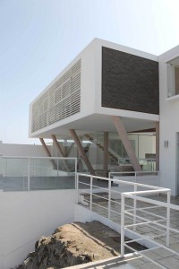 Al nivel superior se accede por la escalera central a través de una escotilla oblicua desde donde se emerge, como en la cubierta de un navío, a un suelo artificial bañado de luz natural que invita a subir y recompensa el esfuerzo con la vista ilimitada al horizonte desde la piscina, la terraza y el estar superior. El volumen en escuadra orienta estos espacios superiores hacia el horizonte marino sin limitar la vista a los vecinos, encuadra la vista al paisaje filtrando la luz, y a manera de parasol protege los niveles bajos.