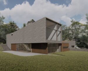 Aprovechando la topografía del terreno, las casas van elevándose conforme sus niveles van ascendiendo en torno al patio, para lograr que en el remate de las viviendas las áreas sociales de los patios y la sala se interrelación en espacialmente y permitan el acceso al ángulo por debajo del volumen sobre elevado que indica la entrada y el inicio del recorrido de la rampa. Esta rampa a manera de una galería de un Claustro recorre la periferia del patio, ascendiendo y relacionando los distintos ambientes para conseguir dilataciones y transparencias que eviten el sentimiento de encerramiento típico de estos espacios centrípetos.