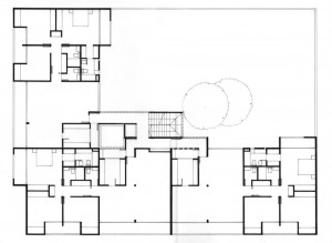 The ground floor is free and the facades are open to the street at double height to be adjusted to the commercial use. In the second floor, three types of housing of dual orientation are aligned to favor natural ventilation and to protect with a thick facade and cantilever their own openings and the commercial front of the first floor.